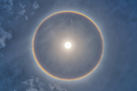 Sun with circular rainbow - sun halo occurring due to ice crystals in atmosphere