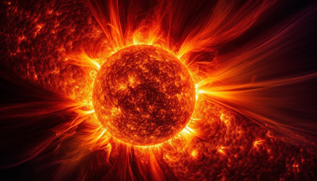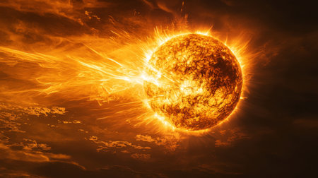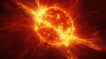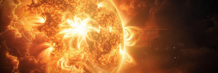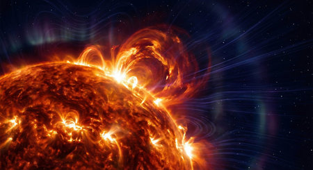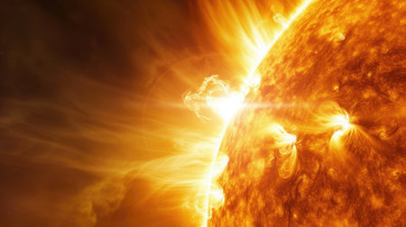 Close-up of the sun with vibrant solar flares and intense magnetic storms. Highlighting the sun's dynamic energy and its impact on space weather