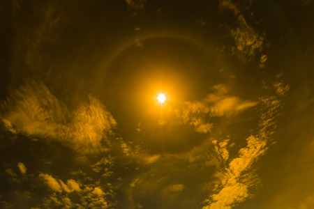 Bright sun with halo - optical phenomena, produced by sunlight interacting with ice crystals in the sky