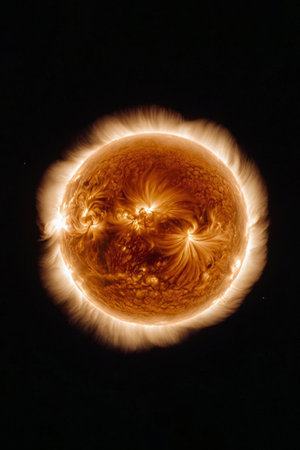 This high-resolution image captures the Sun in space with extraordinary detail, illustrating solar flares, magnetic fields, and coronal loops. A vivid portrayal of our stars immense energy and