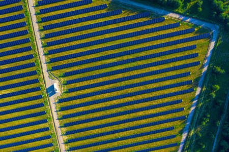 Aerial view of solar power panels on green field, producing clean ecologic energy, sustainable resources