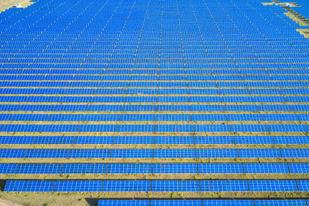 Aerial view of large sustainable electrical power plant with rows of solar photovoltaic panels for producing clean electric energy. Concept of renewable electricity with zero emission