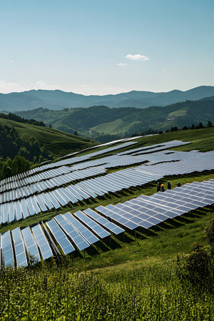 Expansive solar panel array on green hills under bright sky, illustrating the integration of renewable energy into natural landscapes and promoting sustainability
