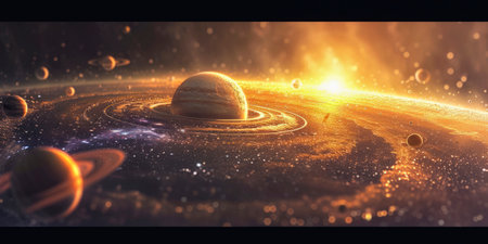 A stunning digital representation of the solar system featuring a bright sun with several orbiting planets, showcasing the beauty of space and astronomy.