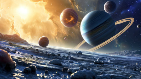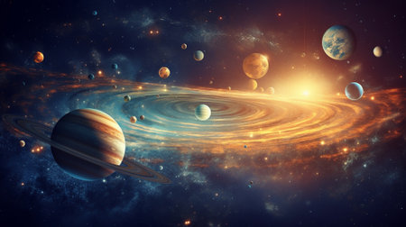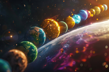 Planets aligning in outer space, orbiting around a brilliant star, create a stunning cosmic vista filled with vibrant colors and celestial wonders