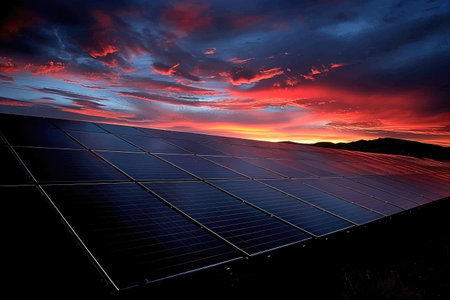Close-up view of solar panels generating renewable energy at perfect sunset for sustainable living