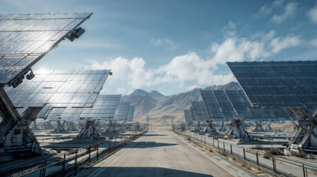 Massive solar panel array installation along desert road with mountain backdrop, showcasing renewable energy infrastructure and sustainable technology.