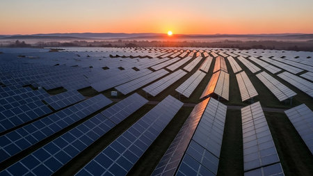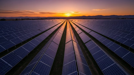 An expansive solar panel farm stretches across a landscape at sunset, with photovoltaic arrays reflecting the warm sun and orange sky.