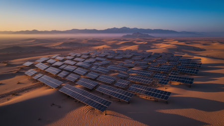 Rows of solar panels blanket the sandy landscape as the sun rises in the background. This renewable energy site represents progress and environmental sustainability in a remote desert setting.
