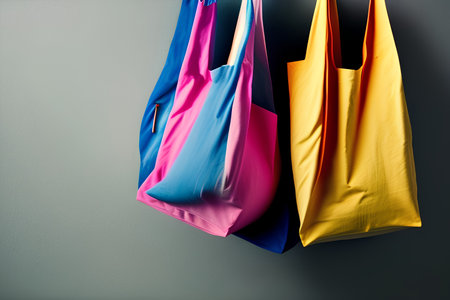 A vibrant image showcasing a row of brightly colored textile shopping bags hanging from a wooden hook against a white wall, promoting eco-friendly and sustainable choices.