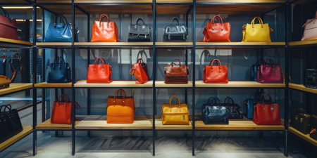 colorful shopping bags lined up on a store shelf, created with generative ai