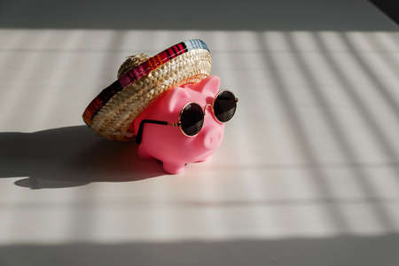 A piggy bank in sunglasses and a sombrero in the shade of the blinds