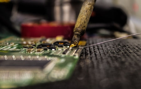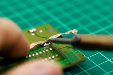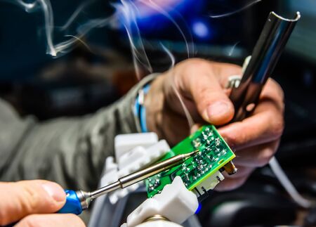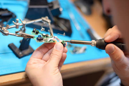 Man technician soldering a circuit board. Service, maintenance or repairing concept