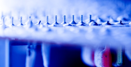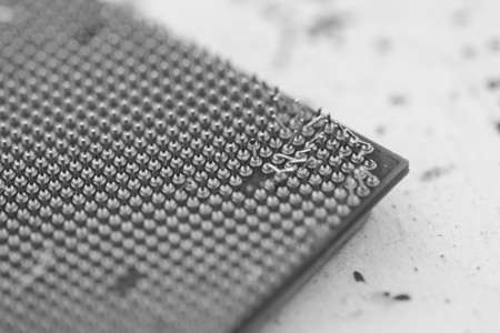 Close-up of a processor's pins on a wooden table. Selective focus.
