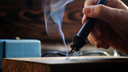 Burn the picture. Woodburning or pyrography. An artist drawing on a wooden plank with pyrograph. Wood burning ASMR creative hobby. Art class workshop. Creative activity. High