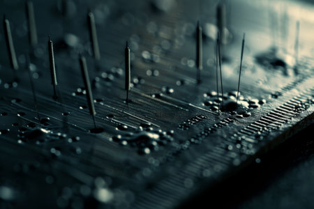 This close-up image features gold-plated pins on a circuit board, showcasing intricate details of electronic connections essential for technology and engineering applications.