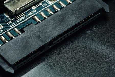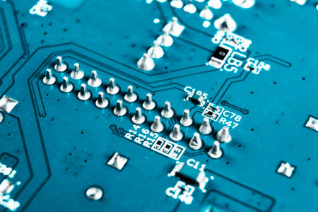Macro shot of Circuit board with resistors microchips and electronic components. Computer hardware technology. Integrated communication processor. Information engineering. Semiconductor. PCB. Closeup