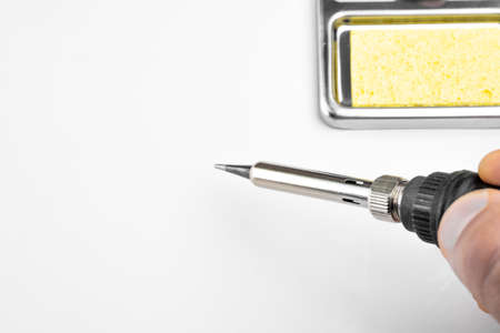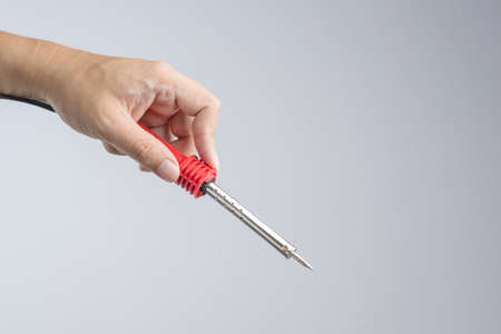 Hand holding soldering iron with a red handle for heating to melt solder in electronic equipment on white background