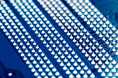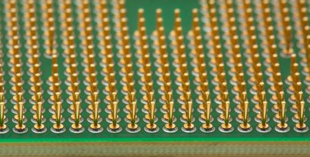 Macro Close up of microchips and pins on Main CPU PC processor circuit board.