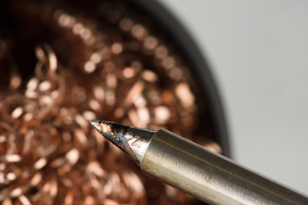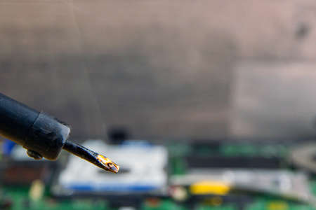 drops of molten metal and rosin on a soldering iron, tin solder, disassembled electronic apparatus in the background. selective focus, close