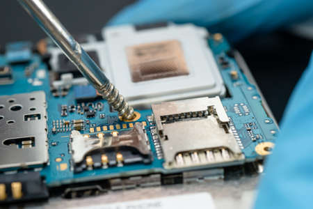 Technician repairing inside of mobile phone by soldering iron. Integrated Circuit. the concept of data, hardware, technology.