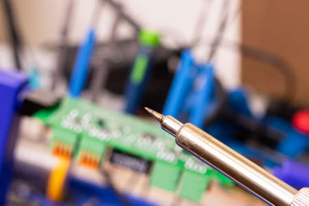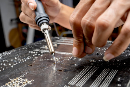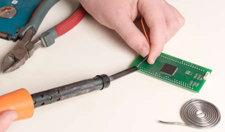 Work in progress. Soldering of electronic circuit board with electronic components. Soldering station. Engineers repair circuit board with soldering iron.