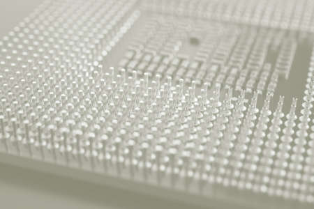 computer processor close-up. Light gray tinted background or backdrop. information technology wallpaper. A pattern of contacts and semiconductors of a PC microprocessor. Macro