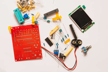 a set of electronic components for assembling a device with a display lie on a light white surface