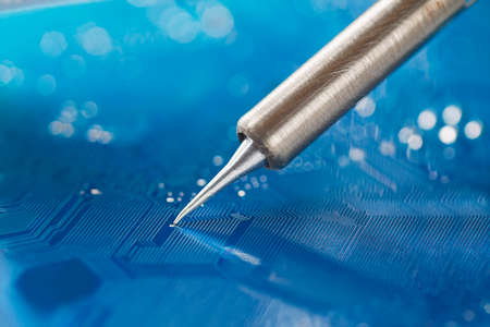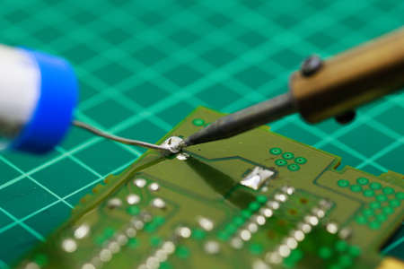 soldering electronic components onto the PCB. Electronics repair and digital technology.