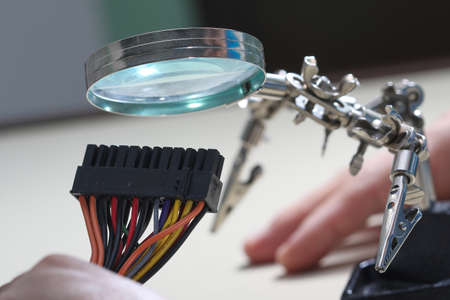 circuit board in soldering helping hands (third hand or auxiliary clip tool) before technological soldering process with wires, soldering iron. hand magnifier with a device for connecting parts