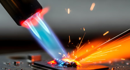 An extreme macro shot captures the intense process of soldering a microchip onto a circuit board. A blowtorch and a soldering iron apply heat, creating bright sparks and melting the solder in a display of precision electronics manufacturing or repair.