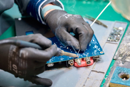Hands wearing gloves solder components on a blue circuit board in a workshop setting during daylight