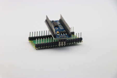 Small electronics integrated circuit IC on empty printed circuit board ready for hand assembly