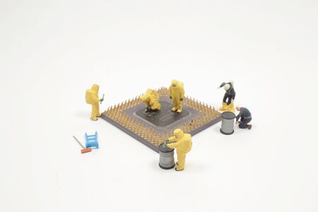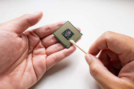 The repair technicians are cleaning the cpu's contacts very carefully to avoid any operational errors and to be safe from dirt.
