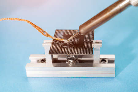 Preparing the processor before reballing. Removing excess tin from the computer processor using a soldering iron and copper braid
