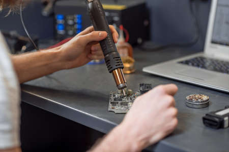 Close-up of a technician repairing a computer chip with a soldering iron, he heats the parts and disconnects them from the Board.