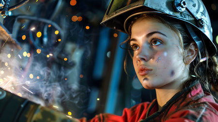 Focused Welder at Work with Protective Gear and Spark Effects in Industrial Setting.