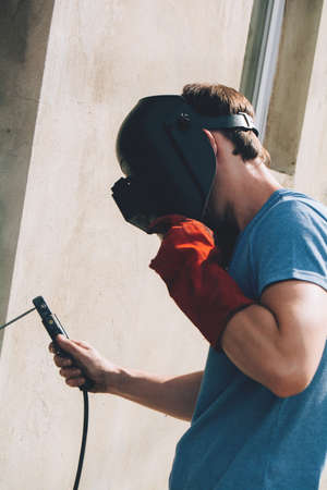 A man works in a protective mask with metal welding. Hand work concept, industry and construction