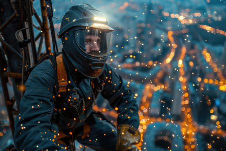 Welder in protective gear is situated high above the city, sparks flying as he works on the metal structure