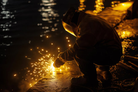 Welder wearing protective gear working on steel structure near water at night, with sparks flying