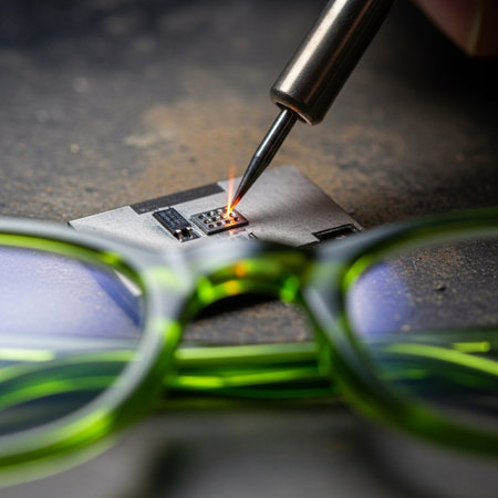 An extreme close-up captures a hand using precision tweezers to carefully place a minuscule component onto a circuit board. The scene is illuminated by a bright desk lamp, highlighting the meticulous detail involved in electronics repair, engineering, and technology.