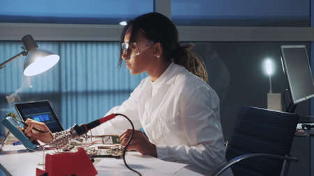 Side view of african american electronics specialist working with multimeter tester, and other electronic devices in laboratory sitting at the table in protective glasses and white robe.