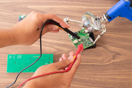 Close up of repairman hands is soldering circuit board of electronic device on the table