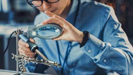 Close Up of a Professional Japanese Development Engineer in Blue Shirt Soldering a Circuit Board in a High Tech Research Laboratory with Modern Computer Equipment.