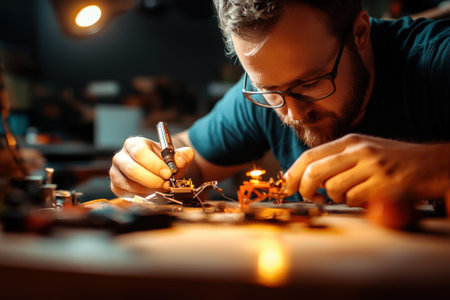 A skilled male engineer meticulously solders a circuit board amid a cluttered, high-tech electronics laboratory filled with equipment and tools.
