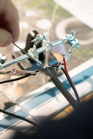 Repairing of a wire for electronic devices. Male hands soldering wire