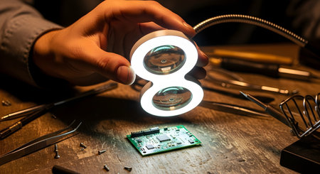 A technician's hand holds an illuminated magnifying lamp to closely inspect a green printed circuit board on a workbench. The scene, filled with tools like tweezers and a soldering iron, represents electronics repair, engineering, research, and detailed technical work.