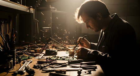 A man is hunched over a cluttered workbench in a dark workshop, illuminated by a single light. He is intently focused on soldering a circuit board, with sparks flying from the soldering iron.