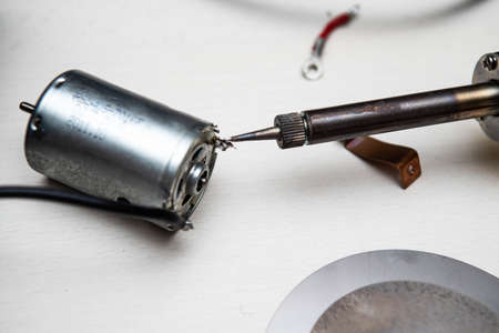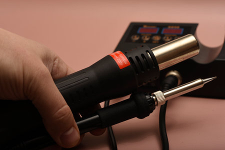 Soldering iron electronic work tool on background.
