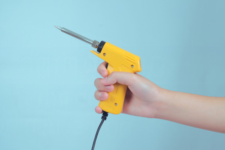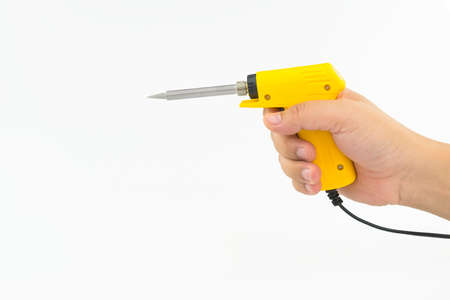 Hand holding electric soldering gun on isolated white background
